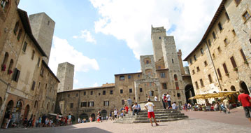 San Gimignano: "la cittą delle belle Torri" is in Tuscany, 56 km south of Florence. It served as an important relay point for pilgrims travelling to or from Rome on the Via Francigena. The patrician families who controlled the town built around 72 tower-houses (some as high as 50 m) as symbols of their wealth and power. Although only 14 have survived, San Gimignano has retained its feudal atmosphere and appearance. The town also has several masterpieces of 14th- and 15th-century Italian art. San Gimignano has been inserted from the Unesco in the list of the world-heritage patrimony of the Humanity.
